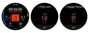 The diver uses the watch to avoids oxygen toxicity risks by monitoring Central Nervous System (CNS) Toxicity and Oxygen Tolerance Unit (OTU). During the dive, oxygen exposure is monitored using CNS, keeping levels below 75%, and maintaining OTU values within the safe range of 100-200 OTUs, ensuring safer breathing at varying depths.